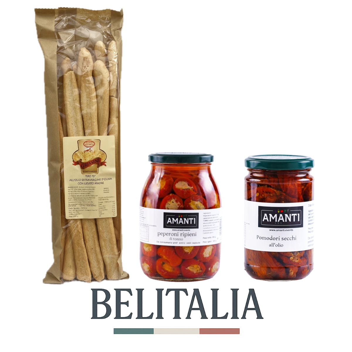 Savourez un apéritif aux parfums du Sud : un pot de poivrons farcis, un pot de tomates séchées et un gressin croustillant offert pour une touche de gourmandise.